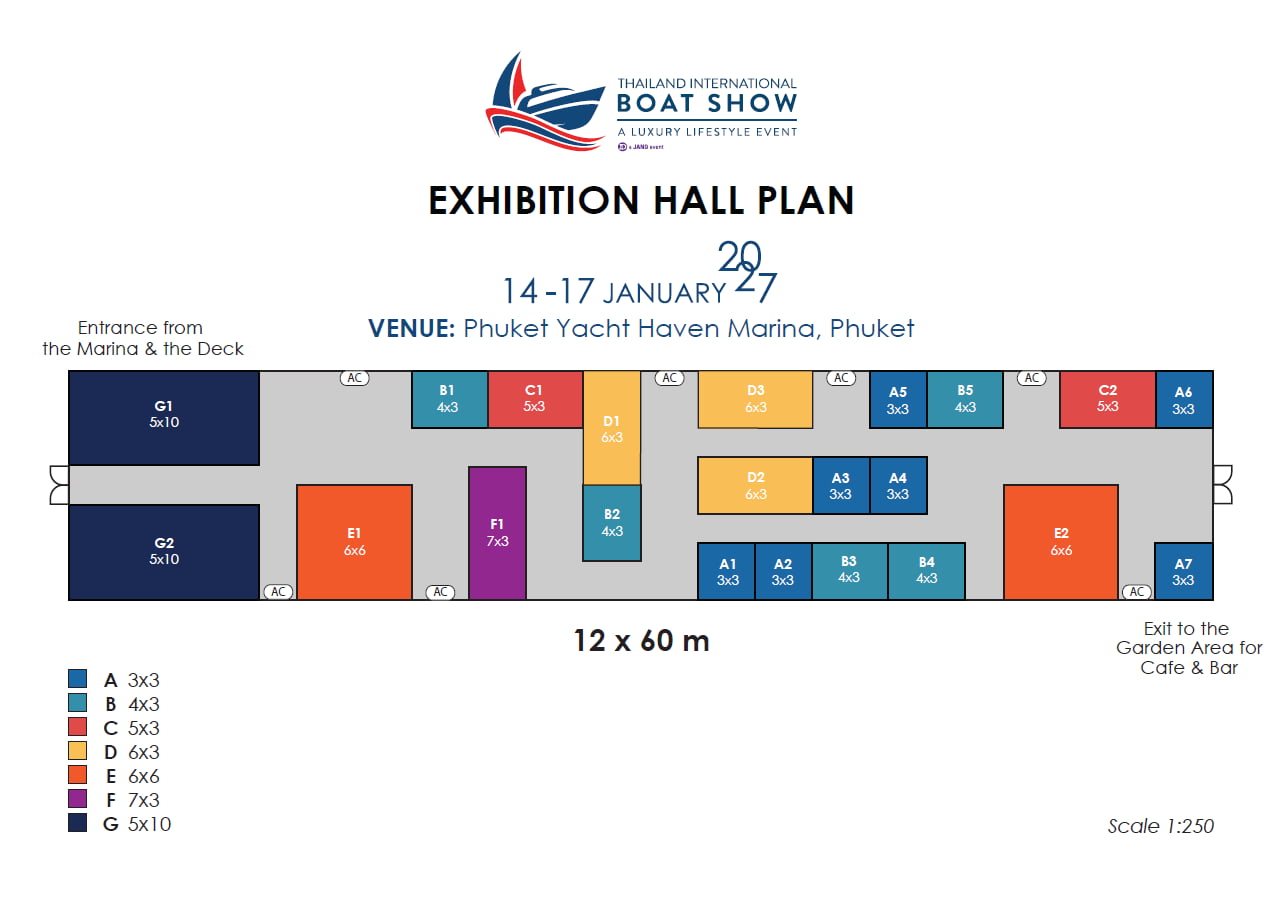 The exhibition area plan for the Thailand International Boat Show, A Luxury Lifestyle Event showcases a well-structured 12 x 60 meter layout. Visitors enter from the Marina and Deck side, passing through a variety of booth sizes ranging from compact 3×3 (A section) to the more prominent, larger booths and lounges. The plan strategically places medium-sized spaces (B, C, D, E zones) throughout, ensuring balanced visibility and flow. The larger booths serve as the highlight, while surrounding booths create an organized grid leading to the exit toward the Garden Area for Café & Bar, encouraging both smooth circulation and engagement with exhibitors.