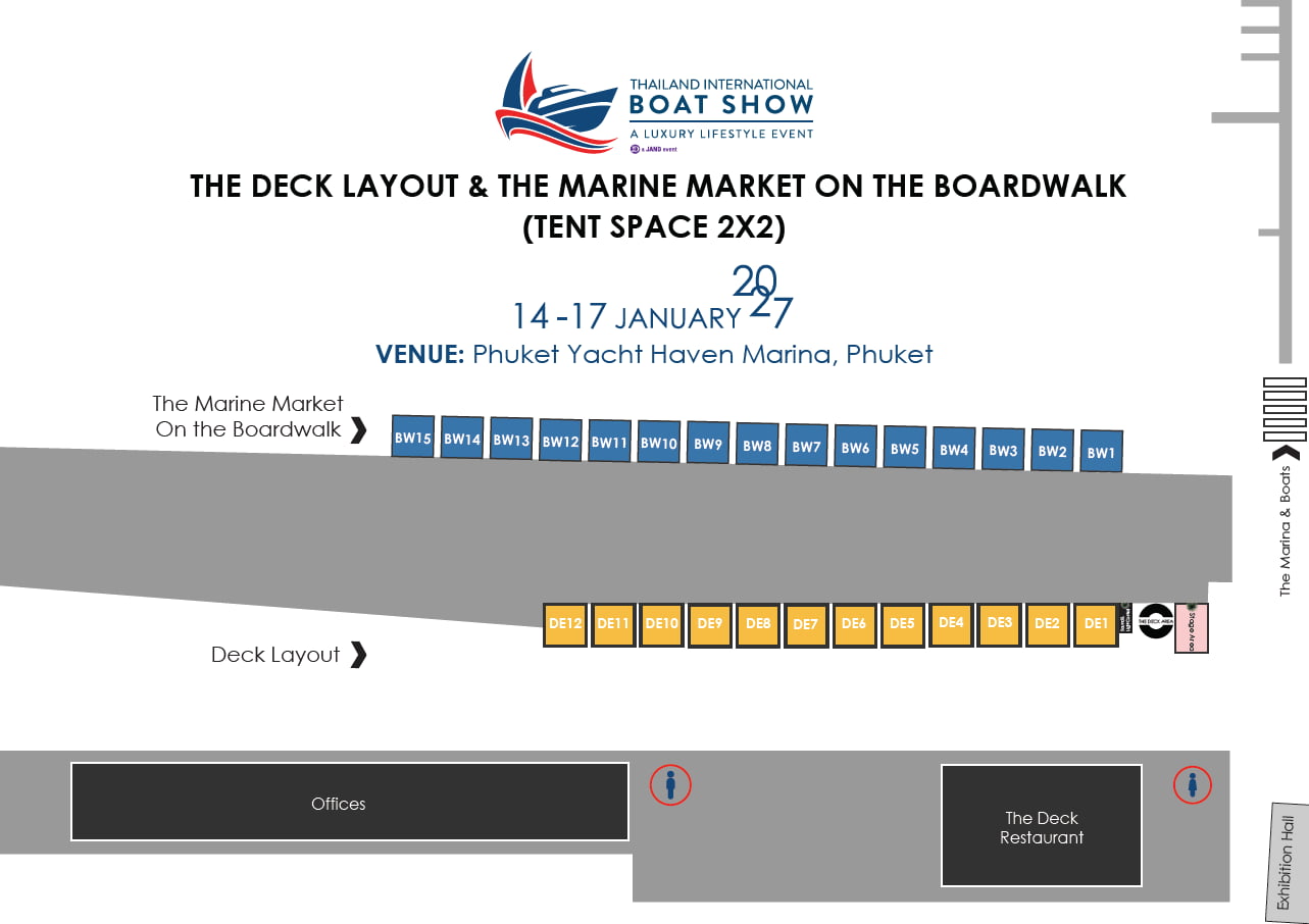 The Outdoor Tent Space Layout for the Thailand International Boat Show, A Luxury Lifestyle Event presents a well-organized setup on the Deck Level and Boardwalk. Along the boardwalk, 15 compact 2m x 2m booths (BW1–BW15) line the waterfront, creating a dynamic showcase area with scenic views. On the Deck Level, a row of booths (D1–D12) provides exhibitors with high visibility near key access points, including the walkway to the marina and the entrance to the exhibition area. The layout is complemented by nearby offices and The Deck Restaurant, ensuring convenience for exhibitors and visitors while maintaining a smooth flow between indoor and outdoor exhibition spaces. The main stage for entertainment and presentations is also on the Deck level, providing visitors with live music, DJs, and much more during the show.